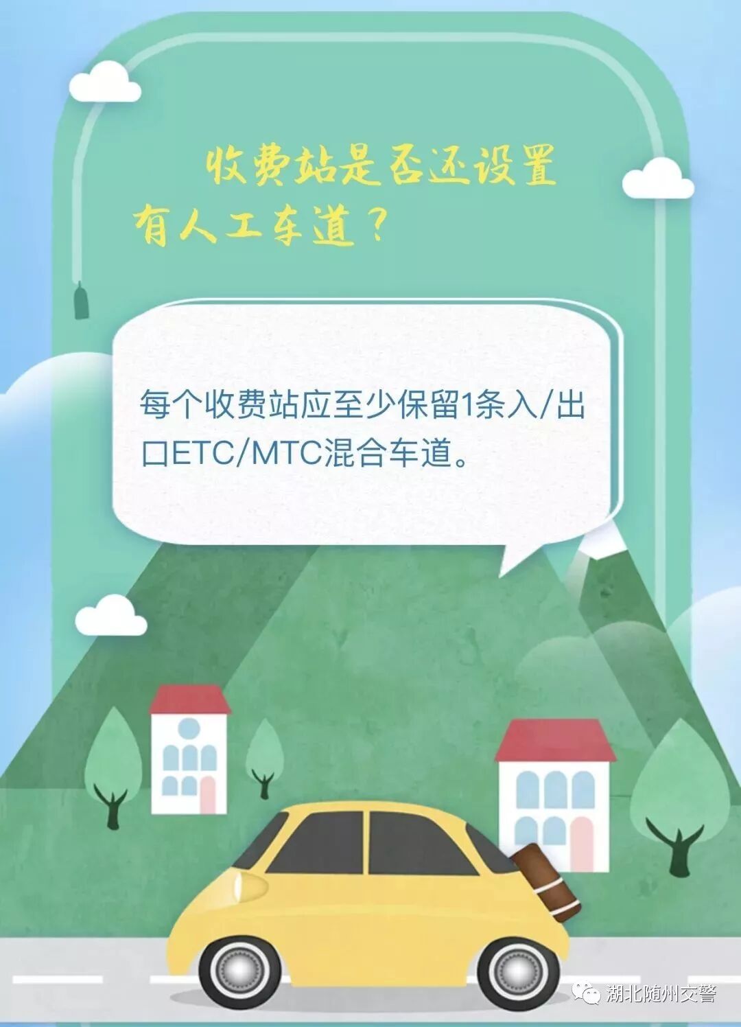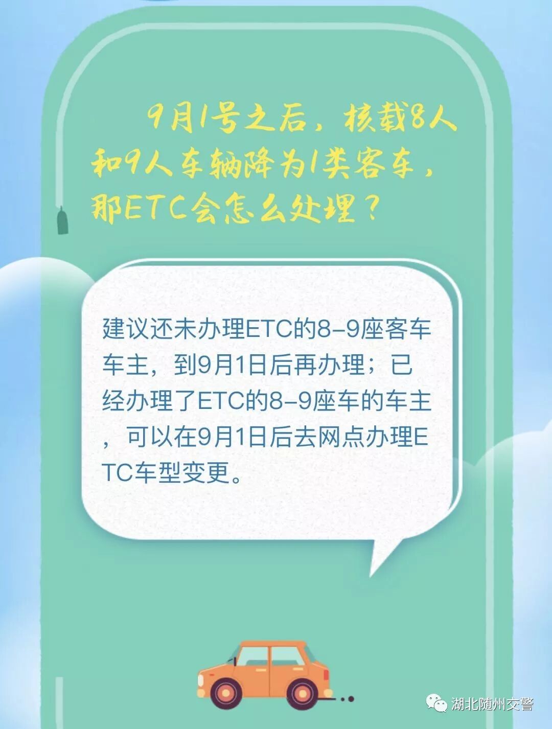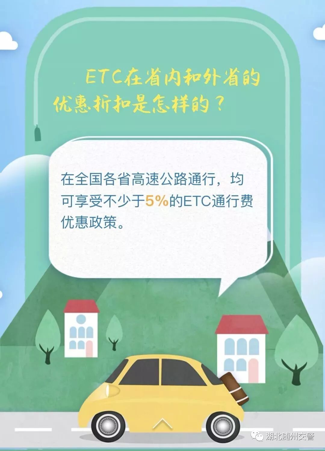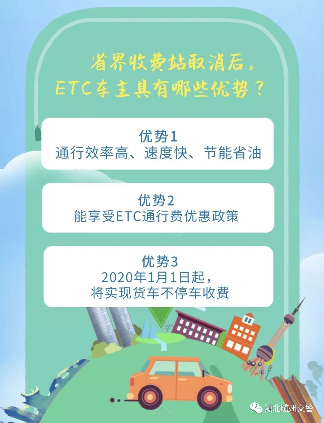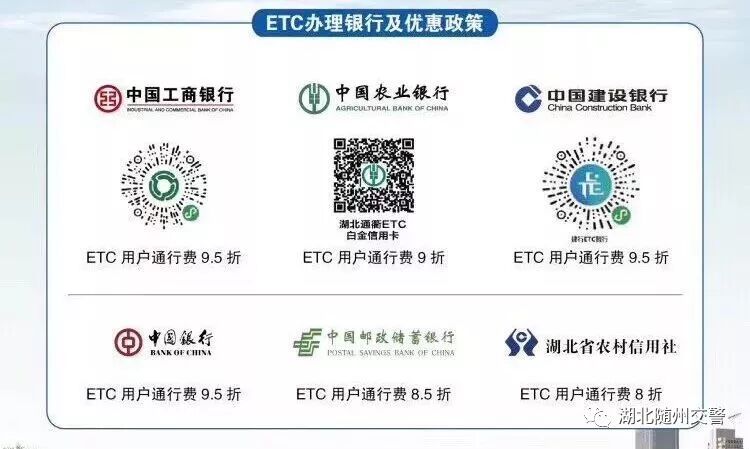 近期, 全国各地都纷纷“放大招”, 加快推进ETC的应用和普及。 湖北省也积极行动起来了! 相关背景 7月5日上午, 湖北省政府新闻办召开新闻发布会,按照国家要求,加快推进我省高速公路ETC安装发行主要有三大目标任务,即到2019年底:一是全省新增ETC用户400万户以上, 二是汽车ETC安装率达到80%以上, 三是通行高速公路车辆ETC使用率达到90%以上。 ![]() 还没有安装ETC的车主 快和小随看过来 什么是ETC ETC说通俗点, 就是电子不停车收费系统 它最大的好处就是不用停 到收费站时自动识别,自动扣费 全程只需要不到三秒就可以完成 ETC安装现状 根据交通运输部截至6月26日统计数据,湖北省已安装高速公路ETC的车辆为261.6万辆, 还需新增396万户; 汽车ETC安装率32.29%, 还需提高49%; 通行高速公路车辆ETC使用率37.16%, 还需提升52.84%。 ETC线上线下安装 湖北省高速公路ETC发行安装工作全面委托6家商业银行代理: 工行、建行、农行、中行、邮储银行 5个省分行及其分支机构, 以及省农信联社及其省农商行系统: 共开设“一站式”银行服务网点4510个。 依托具备条件的政务中心、车管所、机动车检测检验场所、院校、高速公路服务区和收费站出入口广场,以及物流园区、客运站等车辆集中场所,设立阶段性的安装服务点或开展集中上门办理。 与街道、乡镇对接,实现城市服务到社区,农村服务到村组。 积极开发线上发行服务,以支持客户自行注册、自行绑卡、自助安装。 各行业分类安装 2019年7月31日以前,湖北省各级党政机关及所属事业、企业单位、省属高校公务用车(包括救护车、消防车、警车、工程抢险车辆、城市管理执法执勤用车等特种专业技术用车)的ETC装置安装任务。 2019年8月1日起,行政事业单位、国有企业等对所属车辆实行高速公路通行费电子发票报销。并明确要求 “组织本机关和所属单位干部、职工全部安装使用ETC”。 2019年9月底以前,完成除农村客运等完全不行驶高速公路车辆以外的营运客车(包括旅游客车)100%安装使用ETC。 2019年10月底以前,完成出租汽车(含合规网约车)100%安装使用ETC。 2019年12月底以前,完成租赁汽车、公路货运车辆等营运车辆安装使用ETC。 ETC车道将加大改造力度, 直至保留1条人工(混合)车道。 人口车道平均14秒、 ETC车道3秒, 看见办了ETC的小伙伴们搜搜而过, 而你还在排队,不慌么? ETC办理问答 1.安装ETC有什么好处?回复:(1)省时。车辆通过ETC车道只需2至3秒,不需要排队交费。(2)省油。由于使用ETC的车辆可以不停车通行,减少了车辆起步、刹车的频率,降低了油耗以及对车辆的磨损。(3)省钱。2019年7月1日起,湖北已对通行我省高速公路的ETC车辆(包括外省ETC用户)给予通行费5%的无差别基本优惠。(4)环保。使用ETC后,油耗降低了,车辆磨损小了,自然可以减少尾气的排放和对环境的污染。 2.取消省界收费站是不收费了吗? 回复:取消省界收费站不是不收费,而是通过技术手段实现车辆跨省行驶时不停车快捷缴费(即ETC),是收费方式的改变。 3.办理ETC哪些项目是免费的? 回复:现在是全免费办理,即“三免”:免服务费,免ETC卡费,免OBU设备费,不收取任何费用。 4.办理一个ETC需要多长时间? 回复:在证件、银行卡准备齐全的前提下,只需十分钟左右即可办结,随领随用。 5.ETC办理是否需要车主本人亲自去? 回复:中国银行、邮储银行办理ETC要车主本人或持卡人亲自前往。另外4家合作银行ETC办理可以代办,需带车主身份证、行驶证、银行卡、代办人身份证就可办理。 6.ETC办理需要携带哪些证件? 回复: 车主身份证,行驶证,银行卡。 7.周末或节假日能否去办理ETC? 回复:能,工行、建行、农行、中行、邮储银行及农商行银行网点上午9:00-12:00,下午2:00-5:00。 8.办理ETC后会被盗刷吗? 回复:ETC卡不是银行卡,不具备闪付功能,不存在被盗刷的可能。 9.银行储蓄卡能直接办理ETC吗? 回复:目前农商银行、中国银行仅支持信用卡绑定ETC,其他4家合作银行均支持储蓄卡绑定。据了解,中国银行、农商银行正在做系统升级,升级之后,储蓄卡也可以办理ETC。 10.一张身份证能否办理多台车辆ETC? 回复:能,一张身份证可以办理多台车的ETC。但是用于扣费的银行卡绑定ETC台数各银行限制数量不同,如中国银行,一张银行卡作为扣款账户最多能绑定5个ETC。 11.如何销卡重新办理ETC? 回复:在他行销户成功后,才能重新申办。销户时间一般为10到30天。 12.已办理ETC储值卡用户能否转为记账卡? 回复:目前,需要将储值卡里面的钱全部用完之后,在办卡行注销后才能转为记账卡,同行的可以马上转为记账卡,换行办理的,根据不同银行的要求,需10天到30天后才能办理。 13.ETC是怎么扣费的? 回复:从其绑定银行卡里扣费,通过手机短信告知。 14.能否临时借用他人车辆ETC? 回复:ETC只限本车使用,不能借用其他车辆ETC。 15.OBU(即车载电子标签)损坏如何更换? 回复:到始发银行即可办理更换,非人为损坏可免费更换。 16.办理ETC后如何开具报销发票? 回复:在票根网APP上直接开具电子发票。 17.ETC装置突然损坏如何上下高速? 回复:先走人工通道,再到ETC办理银行维护。 18.若ETC自动扣费错误如何申请更正? 回复:可拨打路网中心官方客服电话,待核实之后可以更正,路网中心电话为4009992395。 19.相关 ETC优惠政策是否全国均能享受? 回复:《关于大力推动高速公路ETC发展应用工作的通知》明确从2019年7月1日起,严格落