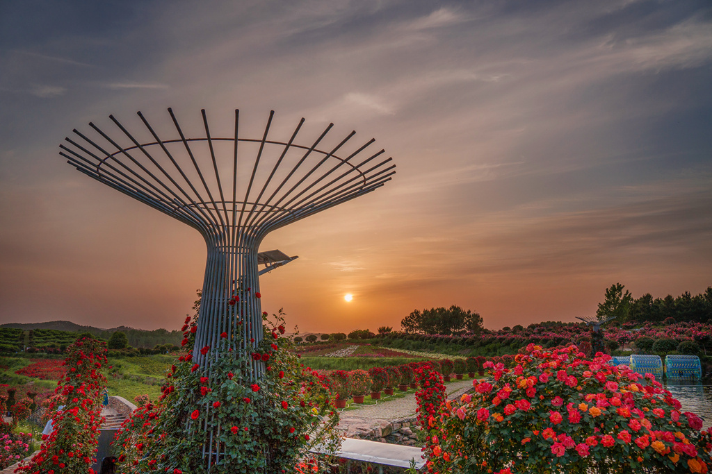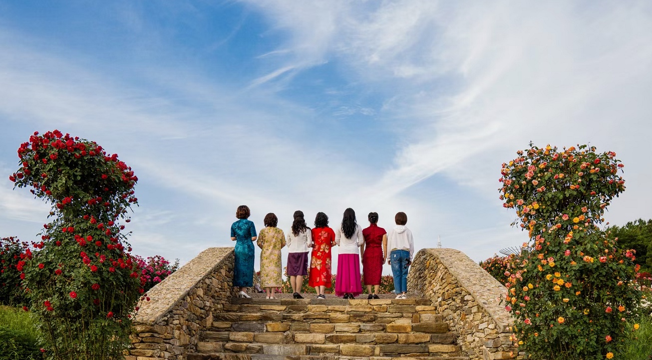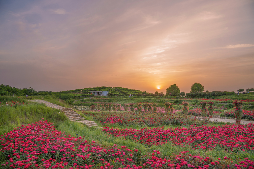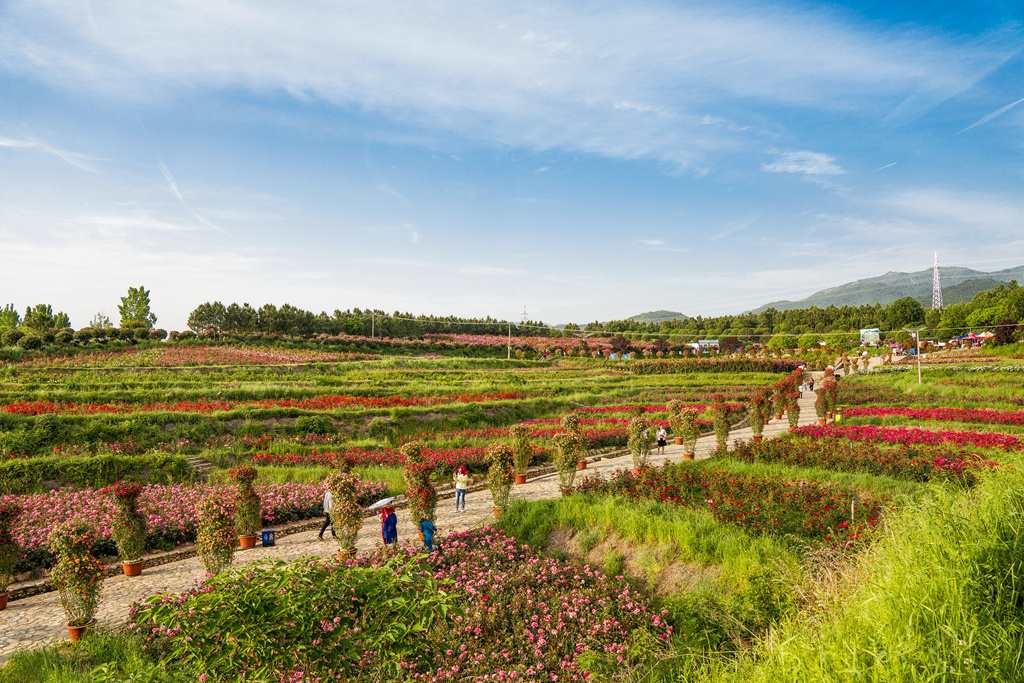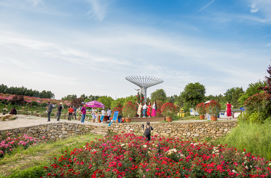 一簇簇月季花千姿百态,惹人喜爱。在和煦的春风里,游客朋友们或徜徉花海,或拍照留念,或花间舞动,一派热闹景象。