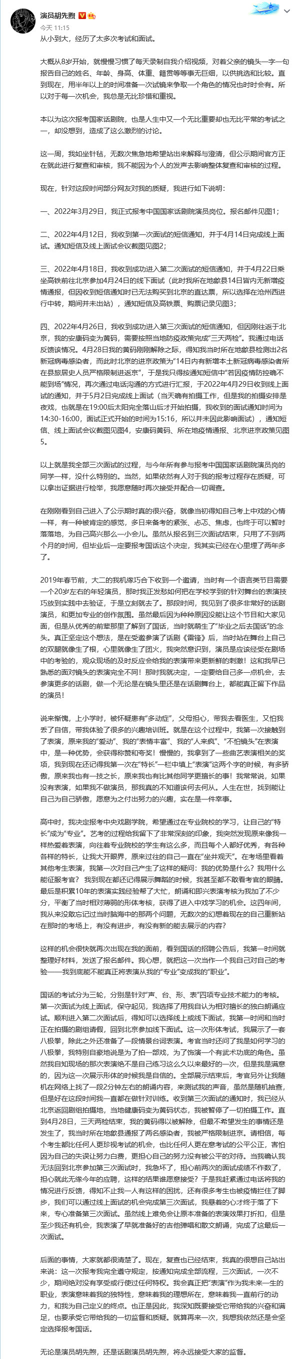 中新网北京7月17日电 演员胡先煦17日就报考国家话剧院一事发布声明称,本次报考完全遵守规定,按通知完成全部流程,三次面试一次不少,期间绝对没有享受或行使过任何特权。 胡先煦表示,每个考生都比任何人更珍视考试的机会,也比任何人更在意考试的公平公正,害怕因为自己的失误让努力白费,更担心自己的努力没有被公平的对待。 胡先煦称,会真正把“表演”作为未来一生的职业,“表演意味着我的独特性,意味着我的理想所在,意味着我一直前行的动力,和我为自己定义的终点。也正是因此,我深知既要接受它带给我的兴奋和满足,也要承受它带给我的一切监督和质疑。就算再来一次,我想我依然还是会坚定选择报考国话。” 声明全文如下: