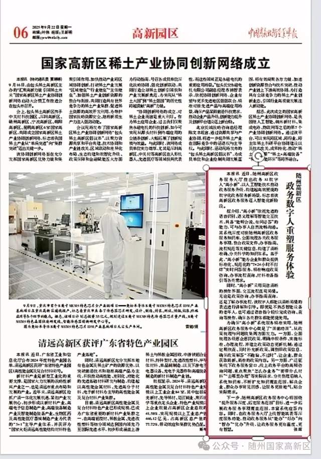 9月22日,《中国高新技术产业导报》第6版(高新园区)以《随州高新区政务数字人重塑服务体验》为题,深度报道了随州高新区在政务服务智能化领域的创新实践。该区通过推出政务AI数字人“高小新”,以人工智能技术推动政务服务升级,构建起高效便捷的数字化服务新场景,标志着政务服务从“能办”向“智办”“优办”的跨越式发展。