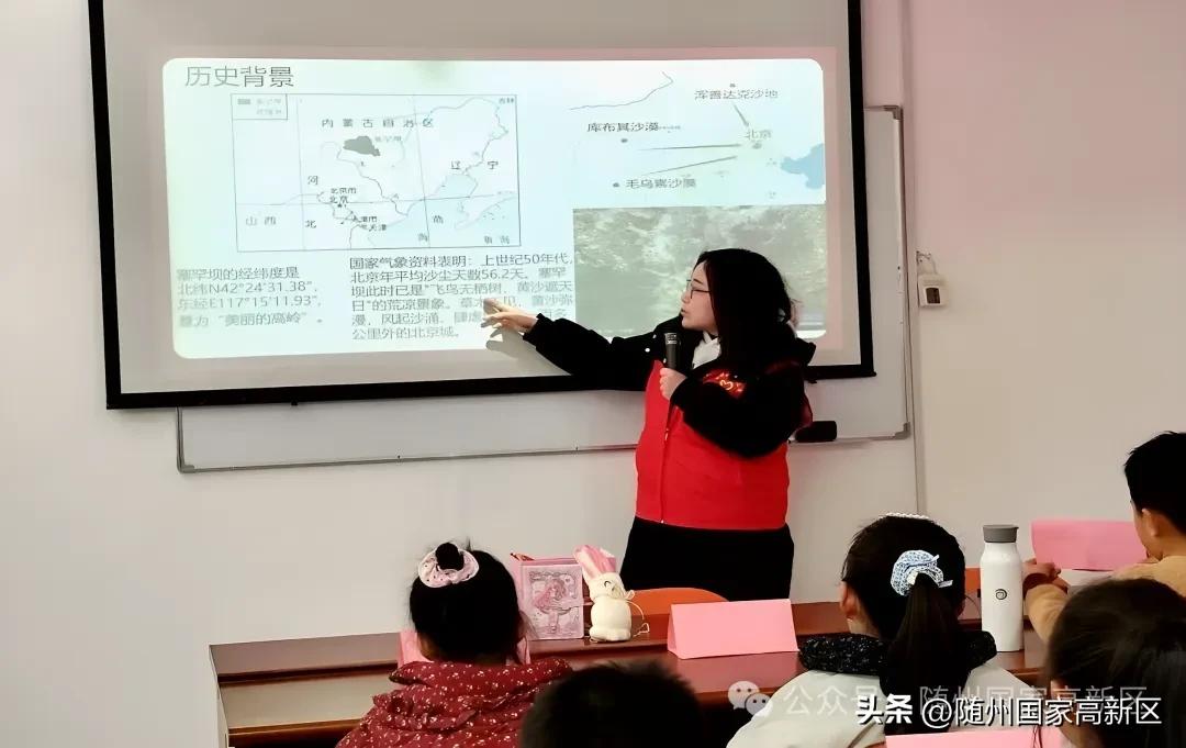 随后,来自黄鹤楼酒业(随州)有限公司的志愿者裴春雨用通俗易懂的语言,讲述了三代“塞罕坝”人战风沙、建林海的感人故事,引导孩子们感悟面对困难勇于担当、锲而不舍的奋斗精神,同时深入浅出地讲解“绿水青山就是金山银山”的绿色发展理念。课堂上,孩子们全神贯注,即便部分知识点超出自身年龄段所学范围,仍积极思考、踊跃回答。其中,甄翊晨小朋友以独特新颖的理解诠释绿色发展理念,赢得现场阵阵称赞。
