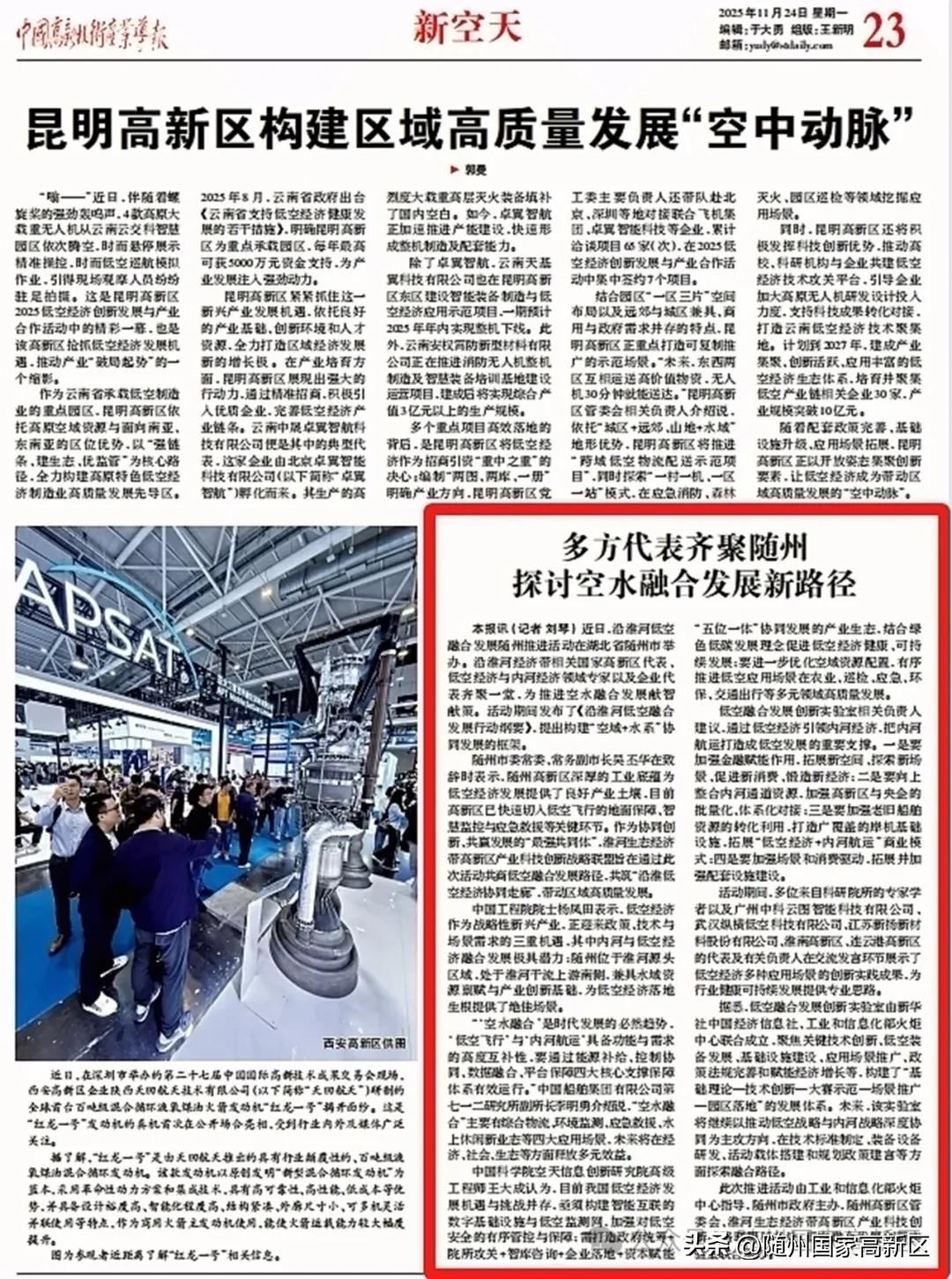 中国工程院院士杨凤田表示,低空经济作为战略性新兴产业,正迎来政策、技术与场景需求的三重机遇,其中内河与低空经济融合发展极具潜力;随州位于淮河源头区域,处于淮河干流上游南侧,兼具水域资源禀赋与产业创新基础,为低空经济落地生根提供了绝佳场景。