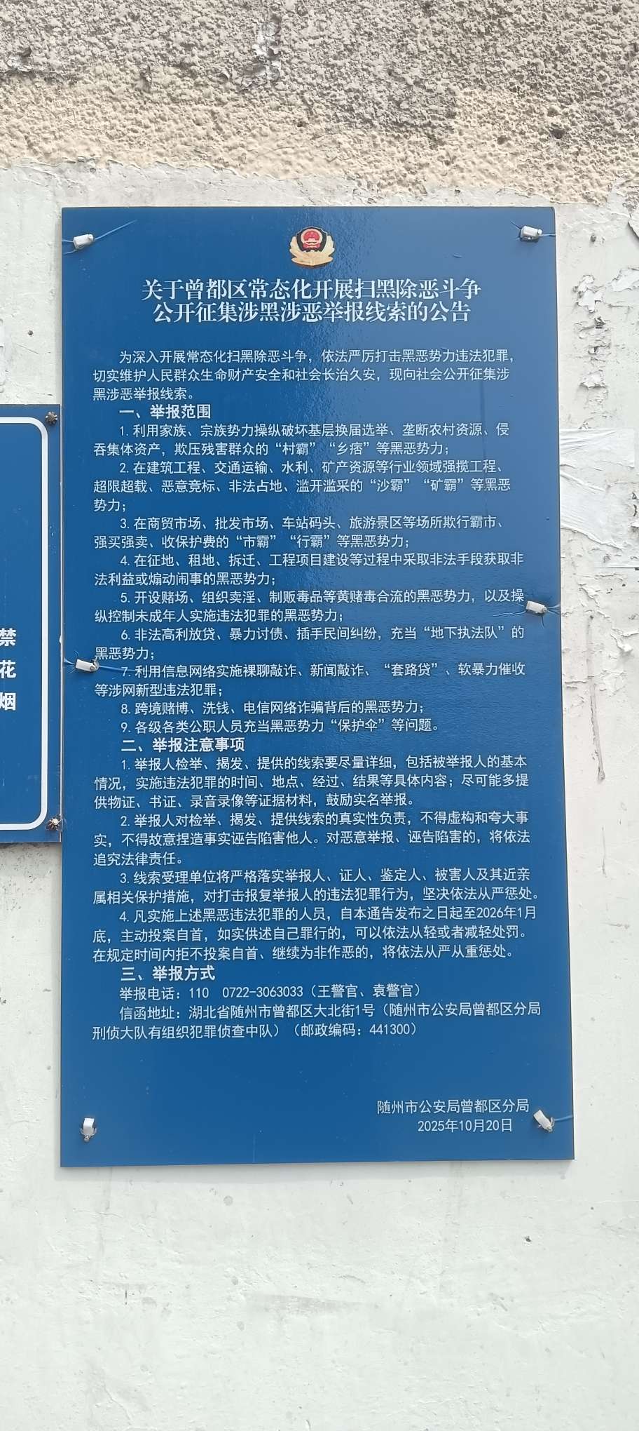 看见墙壁上挂着扫黑除恶务尽经济犯罪欺压百姓霸道横行宗族势力警示牌宣传,要广大人民群众举报问题线索