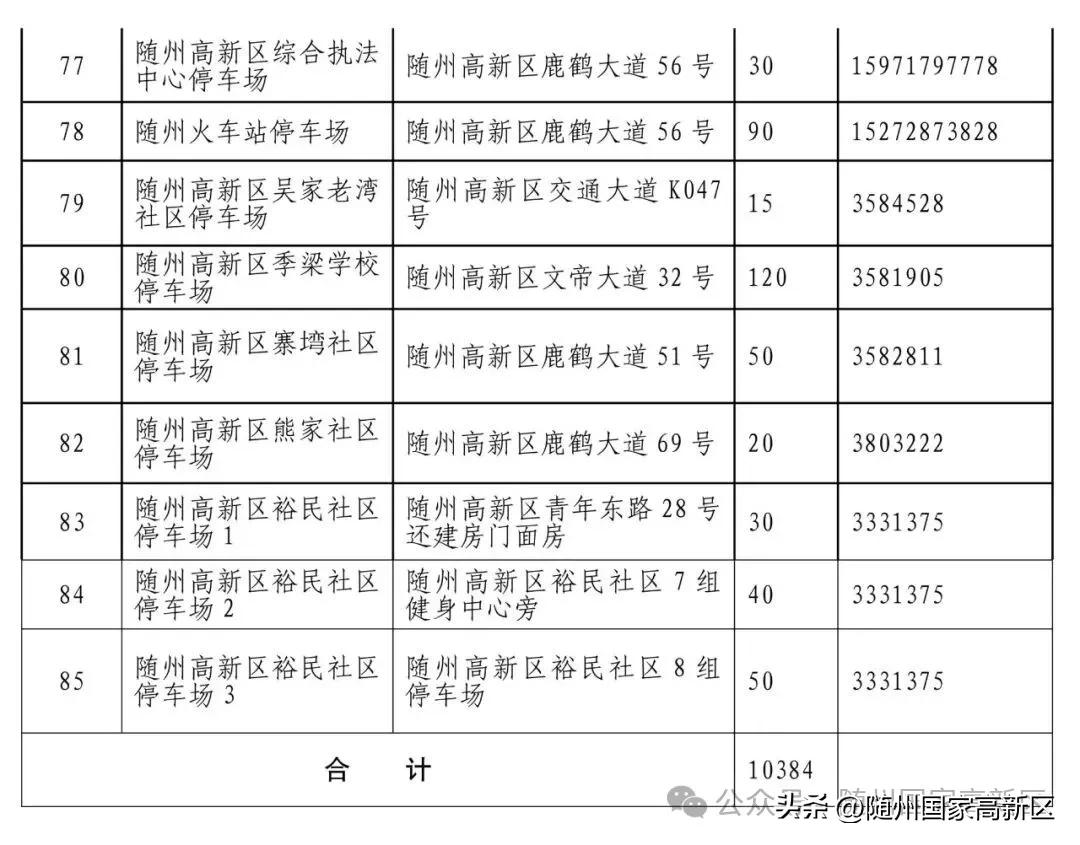 免费开放范围:随州市中心城区(应急涉密单位、医院、学校除外)部分行政事业单位内部停车场、政府投资建设的公共停车场以及道路停车泊位,共计85处场地10384个泊位。其中,高铁南站地下停车场、中心城区道路泊位、市政府停车场等场所提供泊位数量较多。
