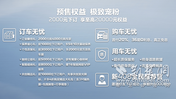 “新408预售宠粉日”当晚,“快乐男团”苏醒、张远和王铮亮化身新408福利官,现场公布预售福利:订车阶段,在2022年8月21日前下订2000元的用户,可享“订金翻倍礼、保养省心礼、个性改装礼、咖啡公益礼、智酷唱响礼、共创精品礼”;购车阶段,2022年8月21日前下订用户,可享36期0利息,首付20%;用车阶段,东风标致还为新408车主提供5年15万公里整车超长质保服务、原厂备件终身质保、终身道路救援、5年基础流量免费畅享,让你用车生活更无忧。