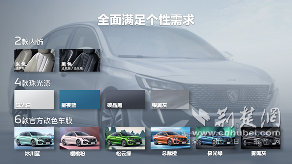 车身颜色上,新408除了提供珠光白、星夜蓝、碳晶黑、银翼灰4款珠光漆配色,还有6款官方改色车膜(冰川蓝、樱桃粉、松云绿、总裁橙、极光绿、雾霭灰),十种车色,全面满足个性需求,让每个用户都能找到属于自己的代表色。前3000位下订用户,赠送2000元官方改色车膜,六款颜色任选。
